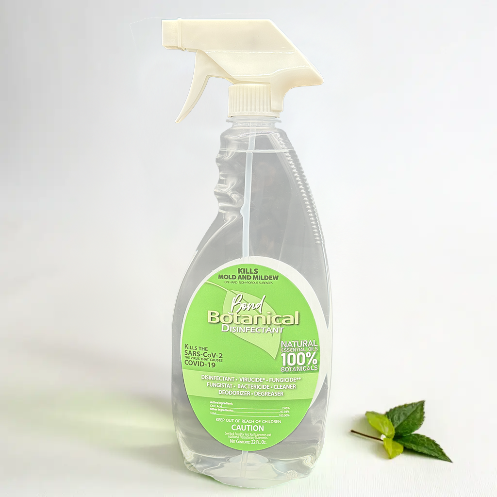 Bond Botanical Disinfectant is 100% Botanical, EPA Registered Hospital Disinfectant. It eliminates 99.9% of viruses and bacteria on hard non-porous surfaces, including SARS-CoV-2, the virus that causes COVID. This disinfectant requires no rinsing after us on food contact surfaces, making it ideal for both residential and commercial use.